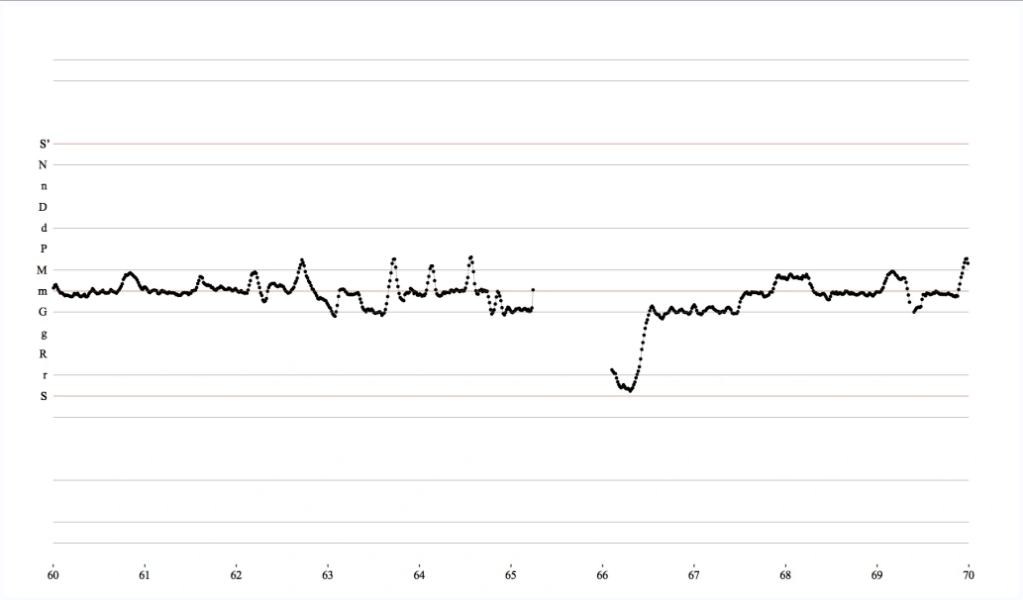PRAAT representation of a fragment of Faiyaz Khan’s alap in Lalit, a graph representation of the opening of rāga Lalit.